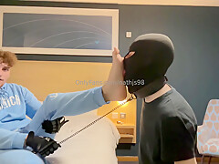Latino boy licking masters feet
